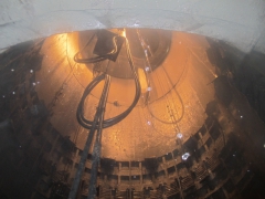 立井竖井施工中,凿井吊盘是形成提升系统、排水系统、抓岩、掘砌、供风、供水、供电等多工序的主要工作平台更是重要的安全保护设施,在正常施工过程中,每次完成一个进度循环,凿井稳盘都要按照施工需要上升或者下降,升降的过程和吊盘的固定、找正找平等工作,给施工进度带来很大的影响;凿井吊盘担负着放置凿井设备、固定吊桶提升轨迹平稳升降、抓岩机装渣晃动的安全隐患、调平吊盘水平快速升降快速找平、防止掉落保护工作面人员施工安全等多种用途;因施工要求吊盘直径必须小于井筒直径约300mm,所以吊盘必然存在摆动,悬吊晃动振动就是摩擦磨损和不平衡的隐患根源,施工设备工作时的晃动震动就必然存在有坠人、坠物、吊盘各处焊接缝开裂等等不安全隐患,又因不断向前掘进中,需要经常升降吊盘,因此固定吊盘醉好能长久不要频繁拆解又要固定牢固还不损害吊盘和井壁,来减少工作量及工作时间,来保障凿井施工安全。