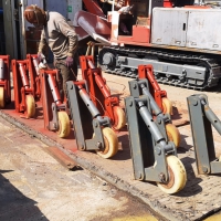 正因为以上的性能,固定顶紧后聚氨酯还有一定的挤压弹性空间,很有效的起到固定又不损害吊盘和井壁还有效保护了施工安全。聚氨酯吊盘固定器DGQ-320通过使可以转动的聚氨酯滚轮压紧在井壁上,从而保证吊盘(稳盘)在作业过程中的稳定性;而且通过调节滚轮的压紧程度,可以直接起、落吊盘,节省调盘、固定吊盘的时间,改变了传统的木楔、液压油缸顶压、弹簧、胶轮等固定方式。